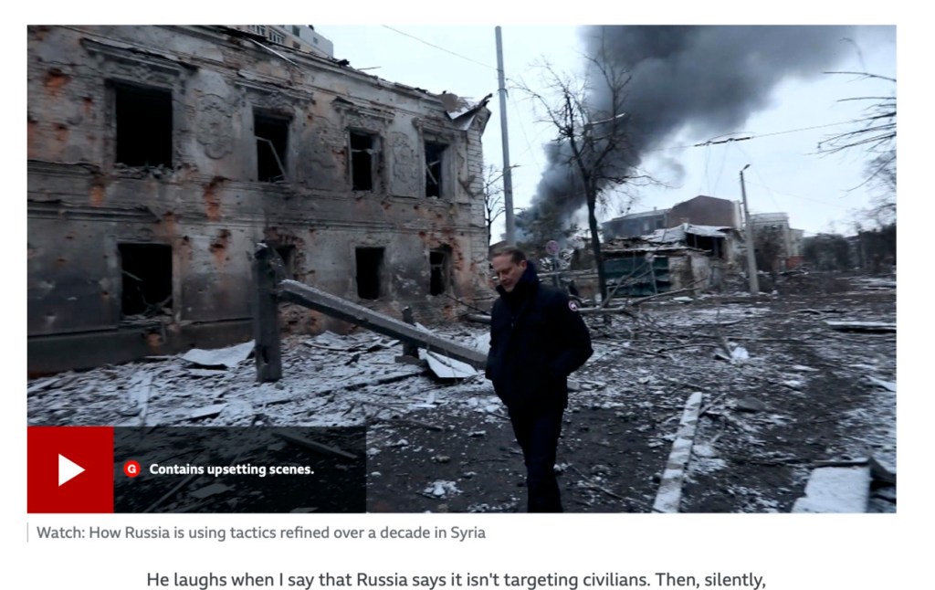 Många videos skildrar kriget i Ukraina. Tittarna varnas innan för starka scener ”contains upsetting scenes”. Verkligheten blir påtaglig och omskakande. Krigsjournalistik i nästan realtid. Närmare kriget kan man som tittare inte komma. Skrämmande men trovärdig rapportering. Bra? Här är det stor fara att gå över den etiska gränsen.