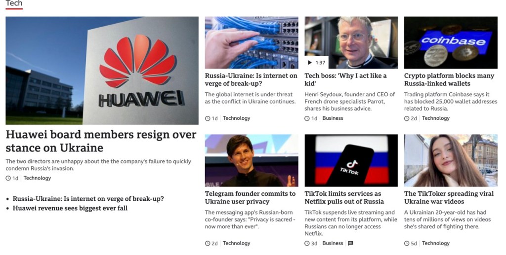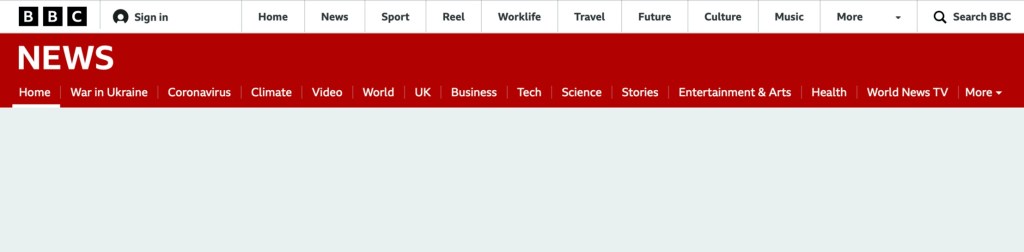 Läser jag webbsidans toppmeny från vänster till höger får jag en klar uppfattning hur BBC News rankar ämnenas aktualitet. Först på menyn är kategorin ”Home” där de mest aktuella nyheterna ligger. Kategorierna ”Coronavirus” och ”Climate” har fått flytta lite längre bort till förmån för ämnet ”War in Ukraine”. BBC News har också engelsk lokal nyhetsrapportering, kategorin ”UK” och bevakning av samtliga världens kontinenter, kategorin ”World”. Det som inte finns, eller i väldigt liten grad, är ämnen inom livsstil som t ex mode, inredning och matlagning. Det ska nämnas att de flesta nyhetskategorierna genomsyras idag av kriget i Ukraina.